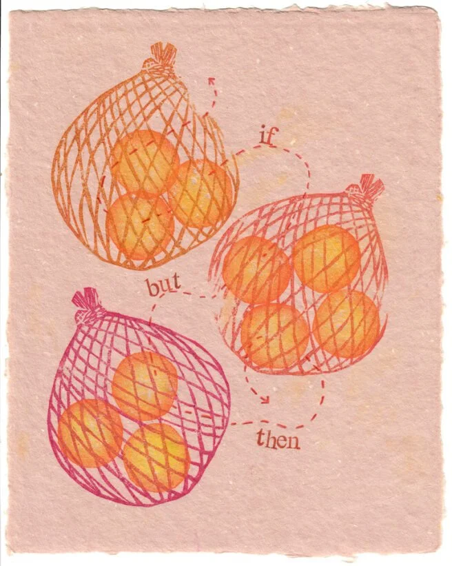 Relief printmaking, similar to canning, preserves something for the future. The carved blocks can be used repeatedly and in varying combinations, allowing them to be blended into new compositions. These blocks have an indefinite shelf life, and my collection now spans almost a decade of artistic exploration. Each piece was made specifically for this publication from newly carved blocks and will continue as an ongoing series.