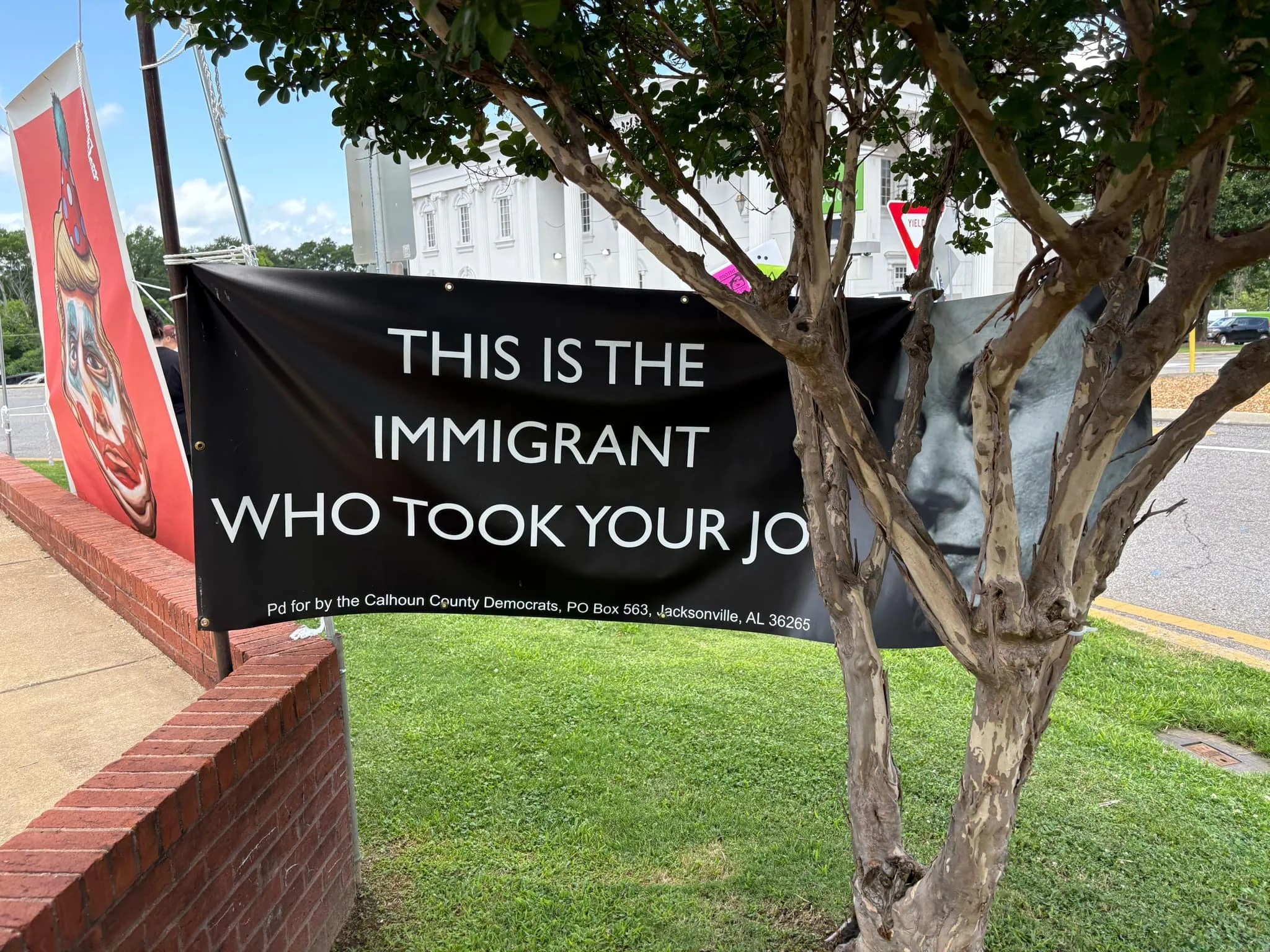 Woman holds sign blocking pro-Trump counter protester. Cambridge, Ohio, Wesley R. Bishop, 2025.